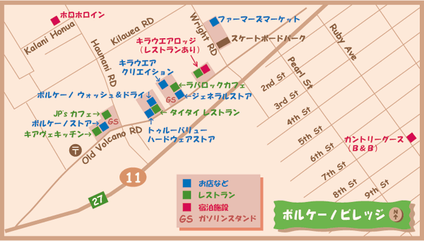 ■ショップ * ボルケーノストア(食料品) * キラウエア・クリエイション(ハワイアンキルト) * ジェネラルストア(食料品、ガソリンスタンド) * ファーマーズ・マーケット(朝市) ■宿泊 * ホロホロイン * カントリーグース(B&B) |