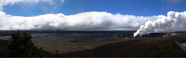 ▼ボルケーノハウスから。噴煙を上げるハレマウマウ火口と、4000mのマウナロア山を望む。(2008年)